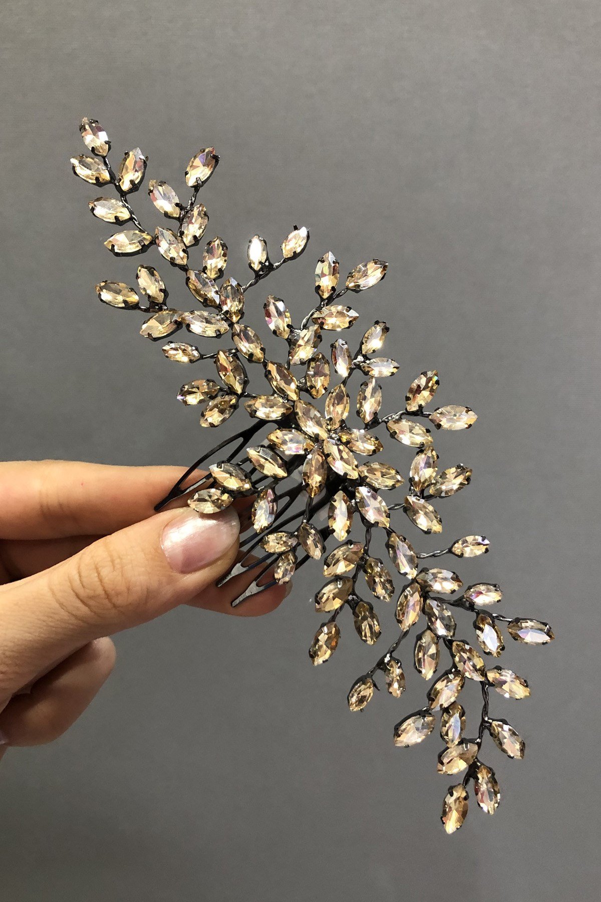 Sarı Taşlı Dal Desenli Siyah Gümüş Gelin Tacı Kristal Cam Taşlı Saç Aksesuarı.