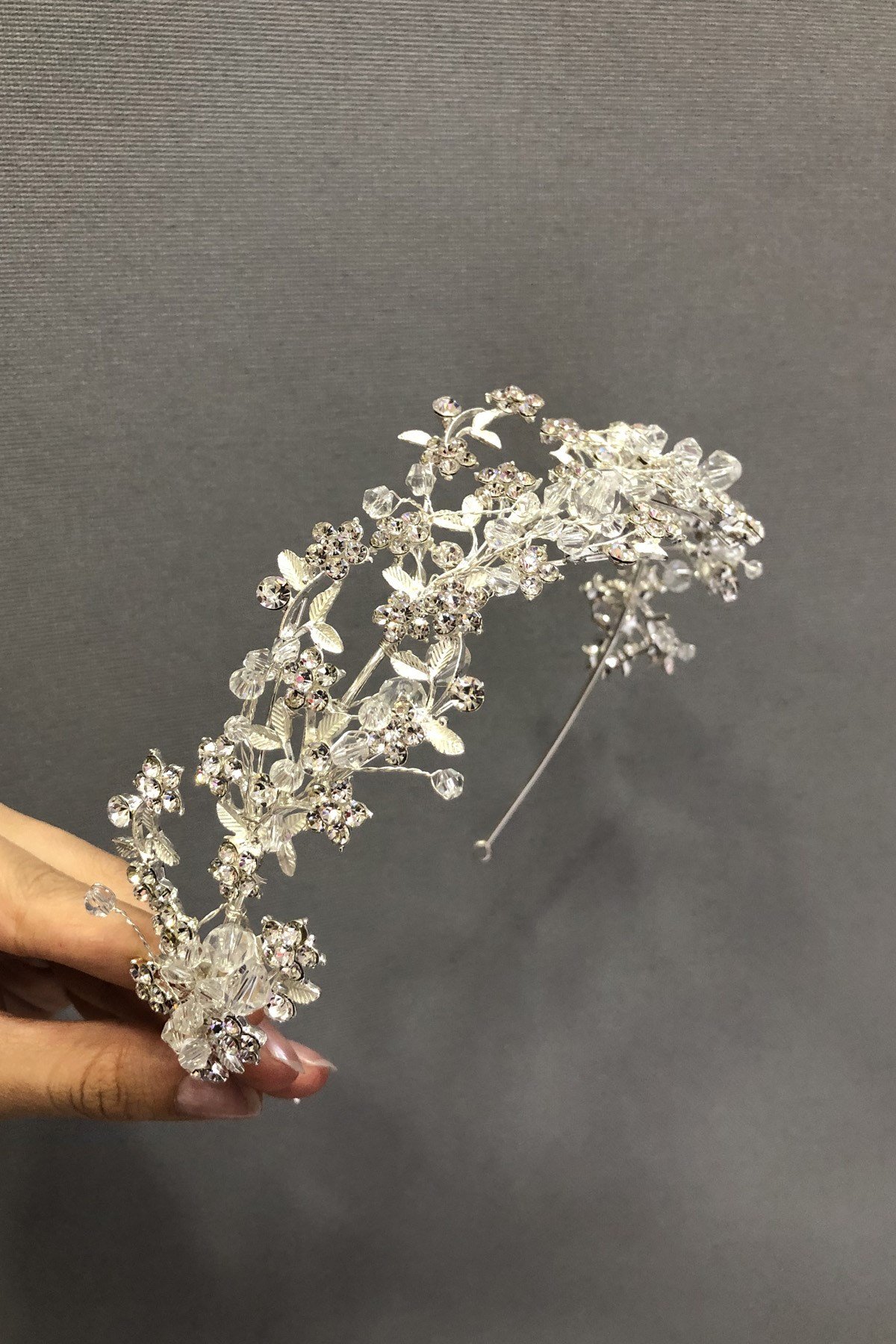 Dal Çiçekli Gümüş Gelin Tacı Kristal Cam Taşlı Saç Aksesuarı.