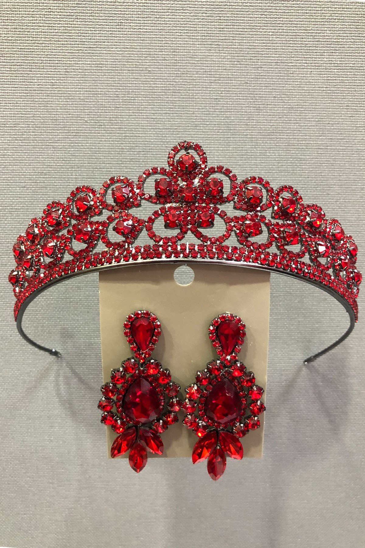 Ece Kırmızı Gelin.Kına Tacı ve Küpe Takımı Kristal Cam Taşlı Saç Aksesuarı