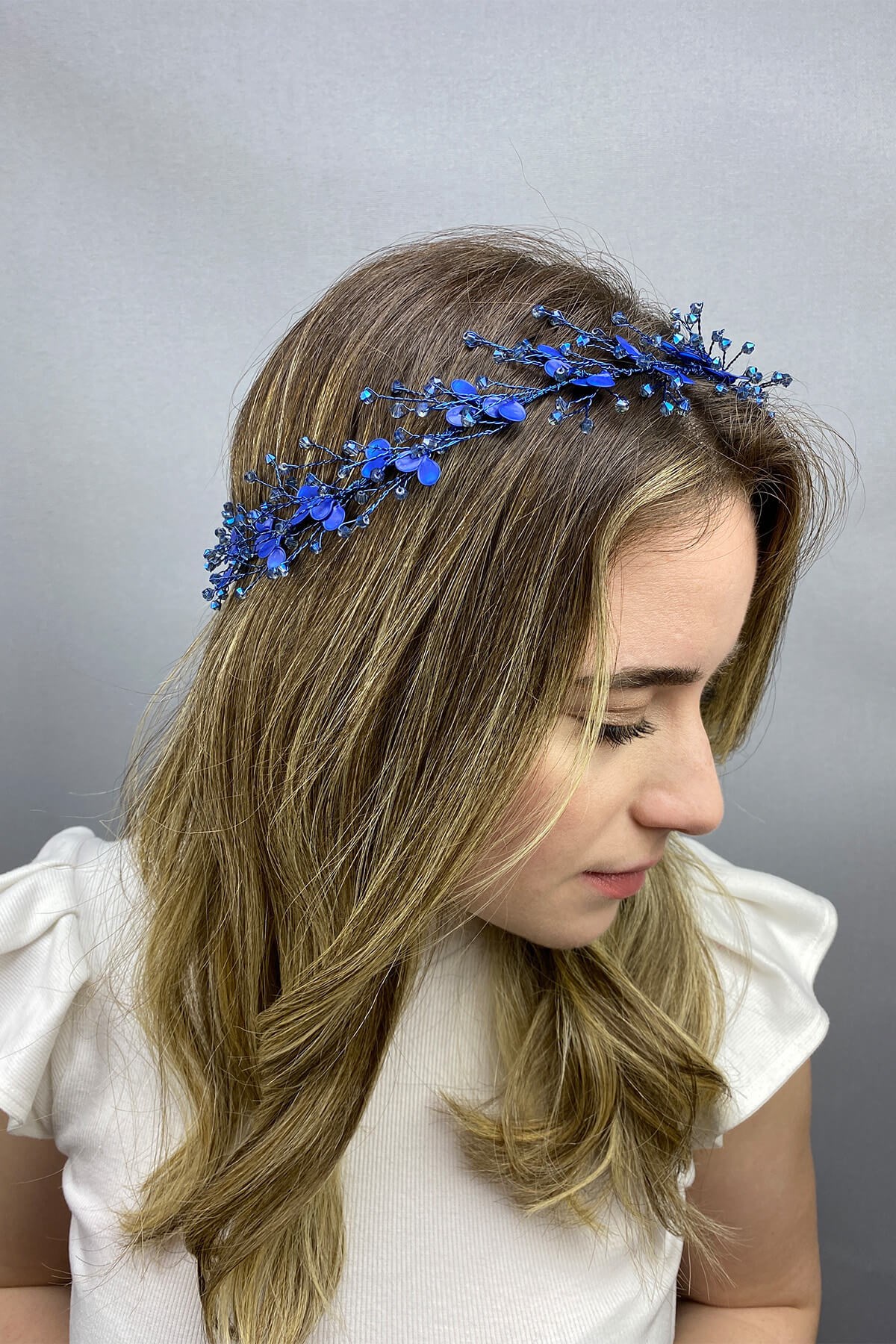 Saks Blue Enamel Spring Branch Hair Accessory Henna Crown Model, which is most preferred by Brides as an Accessory on Bindalı and Henna Clothes, Made with Hand Work. Bridal Henna Crown, a Hair Accessory That Can Be Preferred by Brides Who Want a Glamorous and Elegant Accessory.