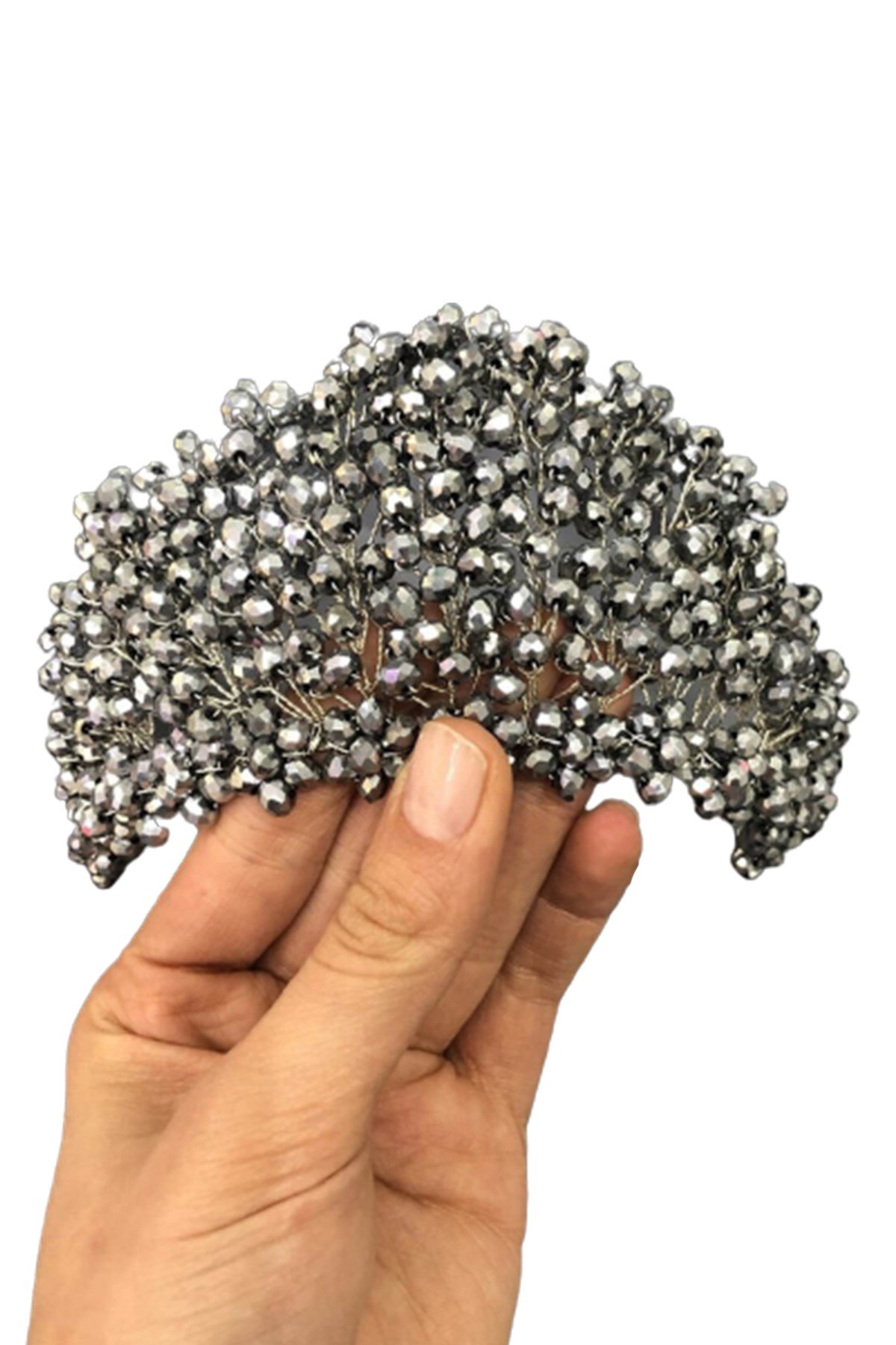 Gri Parlak KAplama Kristal boncuklu gelin ve kına tacı