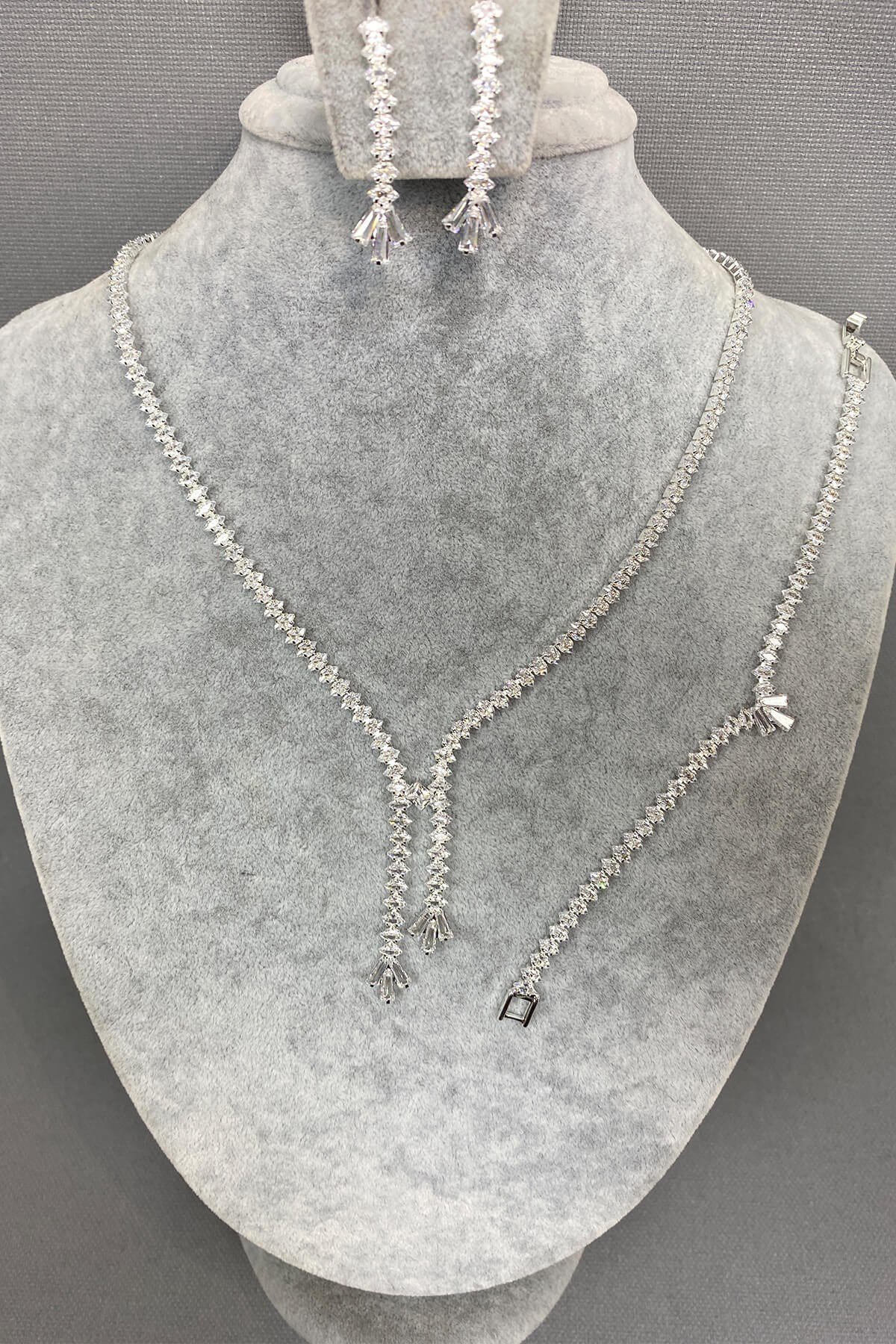 Gümüş Renk Matera Zirkon Taşlı Kolye Bileklik ve Küpe Seti