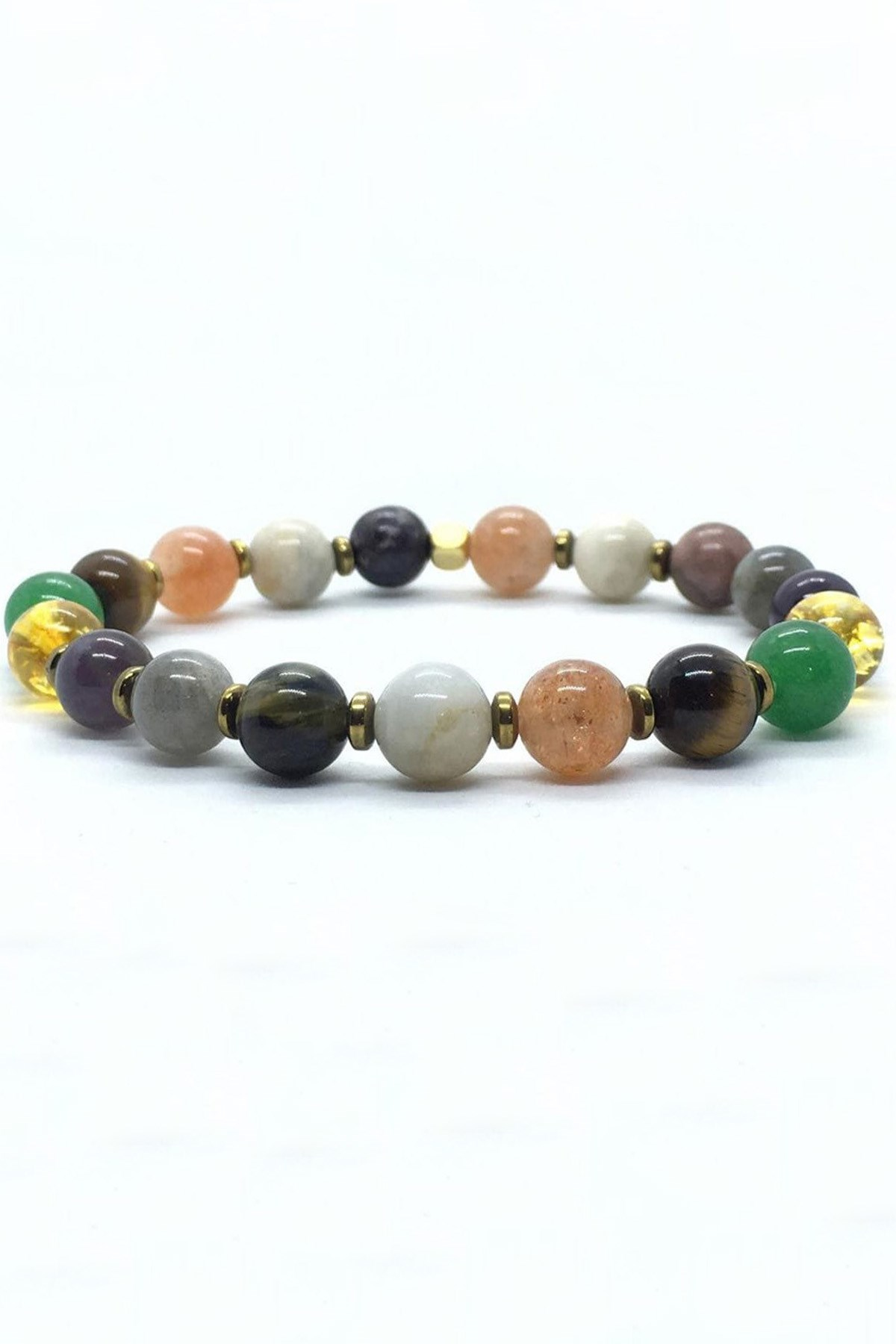 Güneş Taşı ve Kaplan Gözü Taşı Bileklik Karma Bu Özel Üründe Kullanılan Doğal Taşlar 1-Güneş taşı 2-Kaplan Gözü 3-Aytaşı 4–Lepidolit 5-Labradorit 6-Ametist 7-Sitrin 8-Aventurin 9-Hematit