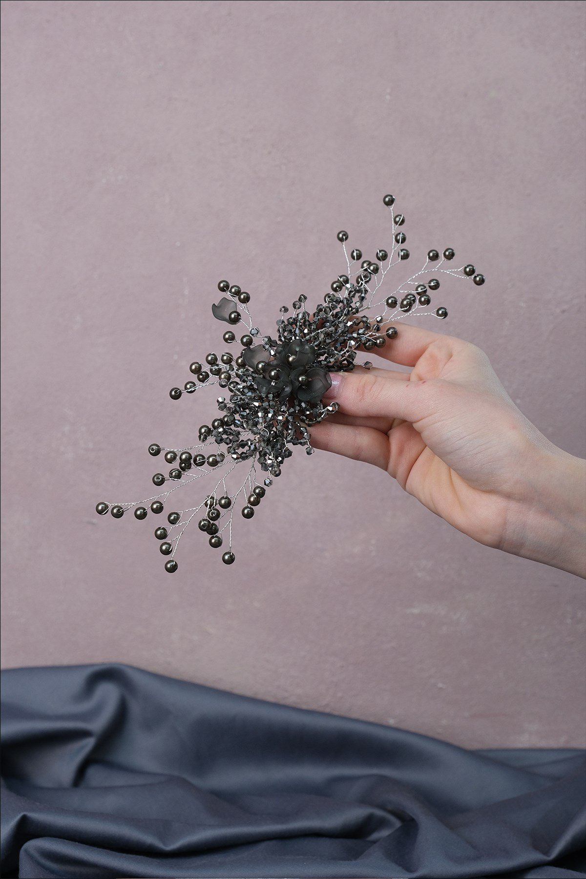 Koyu Gri İrem İnci Boncuklu Saç ve Türban Aksesuarı