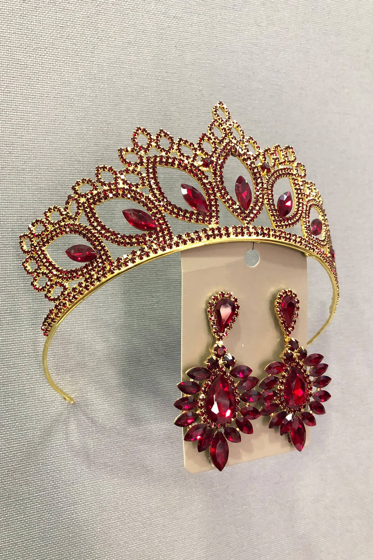 Koyu Kırmızı Kristal Taşlı Altın Rengi Gelin Tacı ve Küpe Takımı (TAC-219)