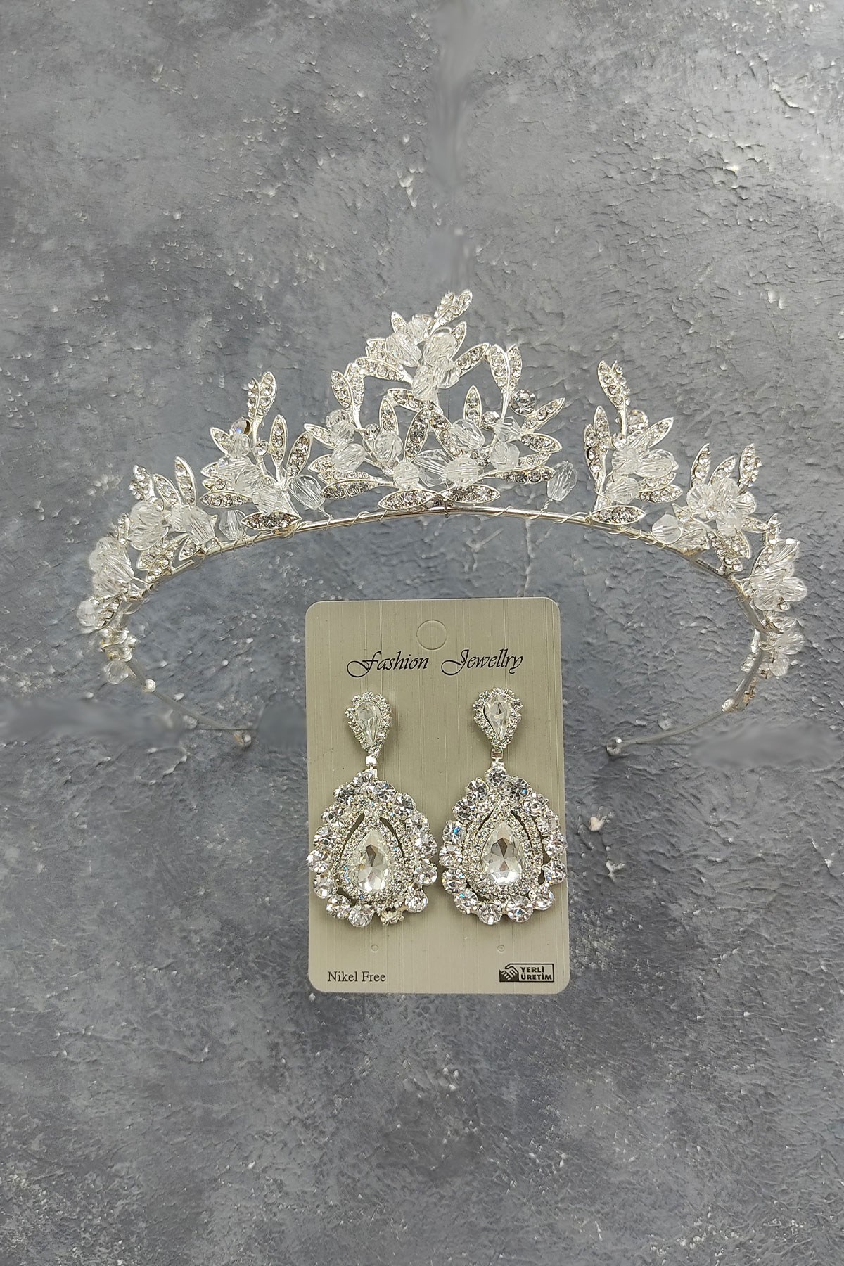 Kraz Model Gelin Tacı ve Mekik Taşlı Küpe: