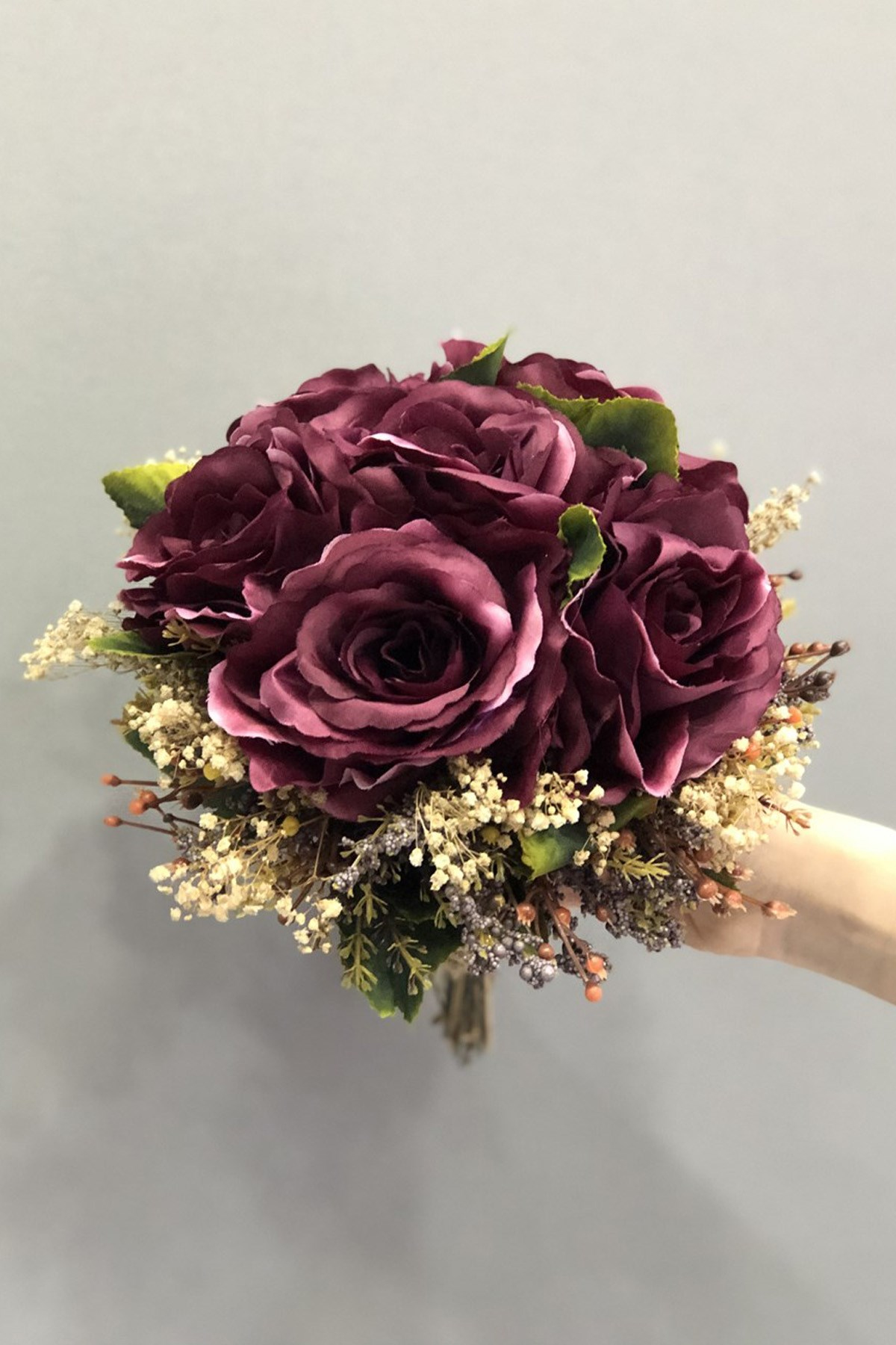 Doğal Ve Yapay Çiçek Karışımı Mürdüm Yapay ve Kuru Çiçekli Gelin Çiçegi