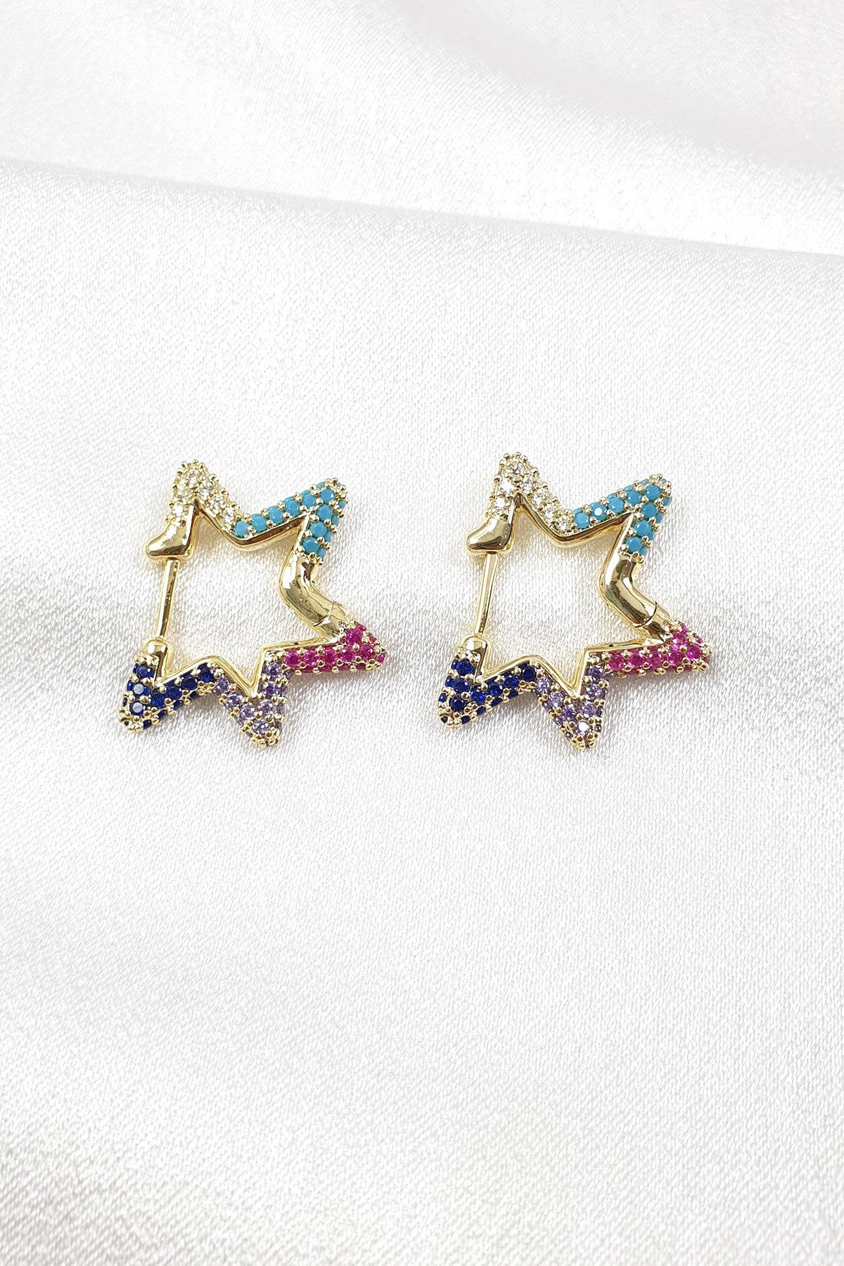 Renkli Yıldız Desenli Gold Zirkon Küpe Taşlı İncili ve Zirkon Küpeler Günlük Hayata Tercih Edilen Trend Küpe Gurubu.