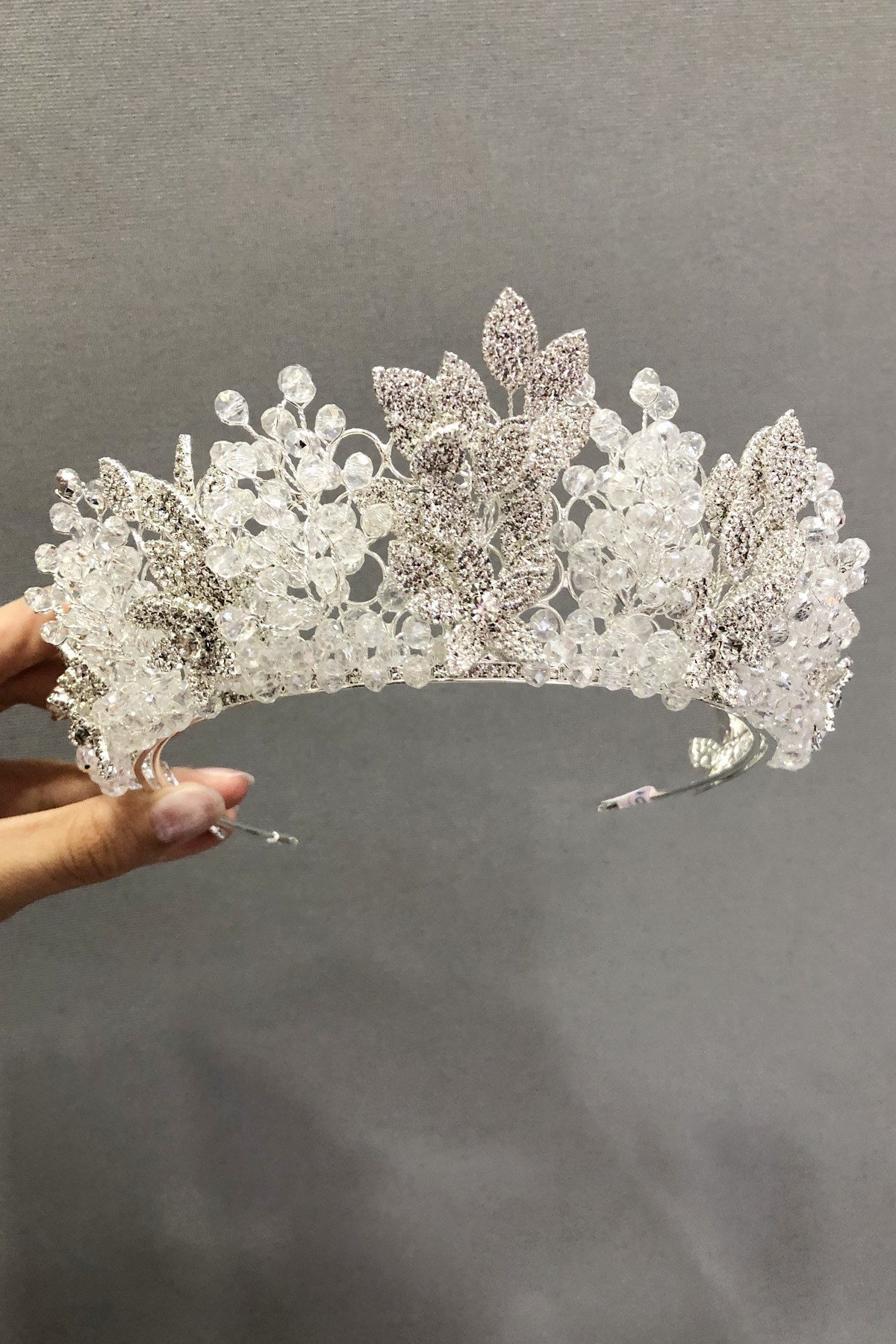 Kalın Yapraklı Kristal Taşlı Gelin Tacı Kristal Cam Taşlı Saç Aksesuarı.