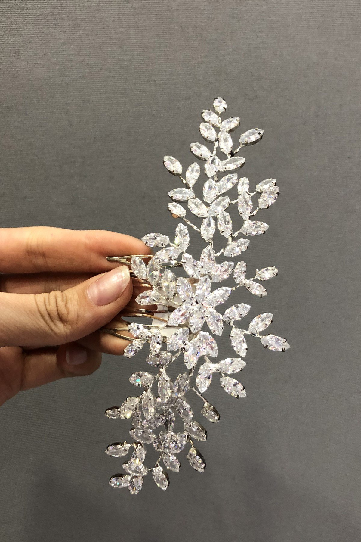 Taşlı Dal Desenli Gümüş Gelin Tacı Kristal Cam Taşlı Saç Aksesuarı.
