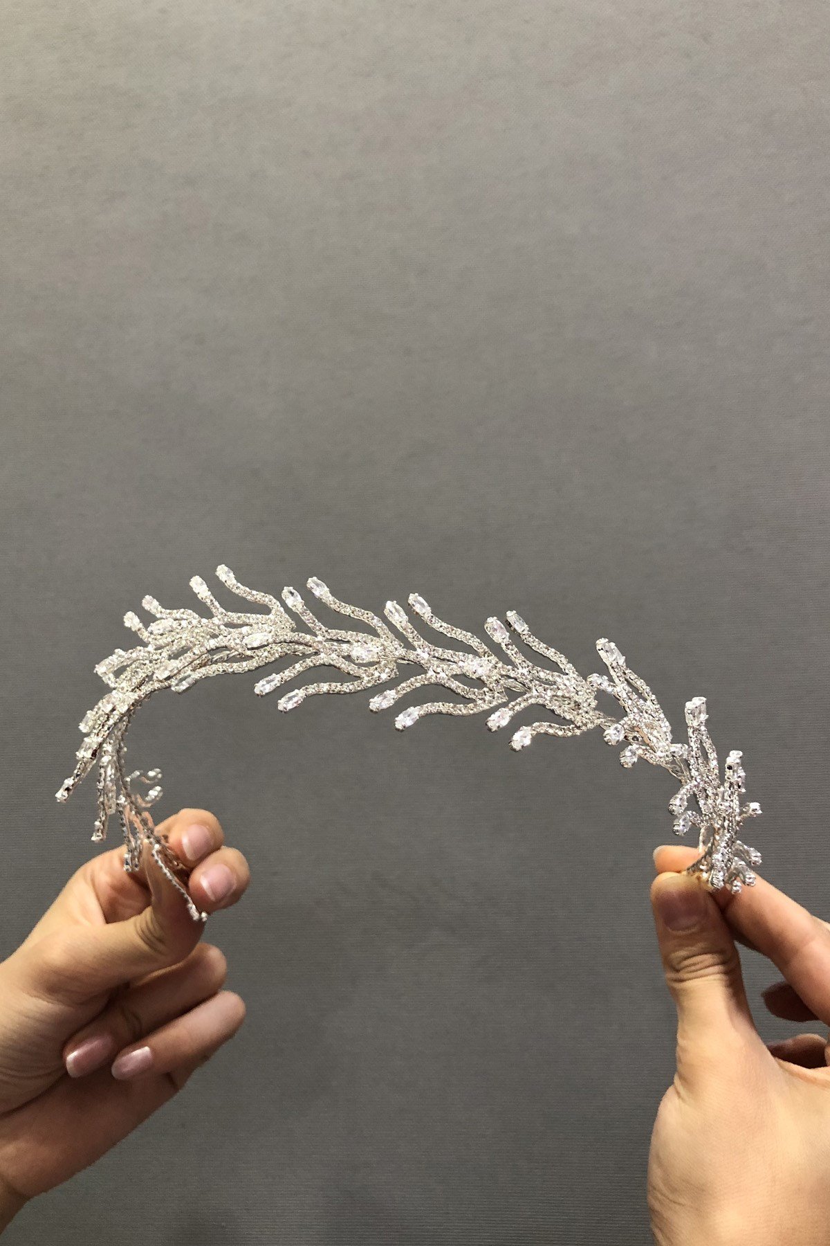 Dal Desenli Kristal Taşlı Gelin Tacı Kristal Cam Taşlı Saç Aksesuarı.